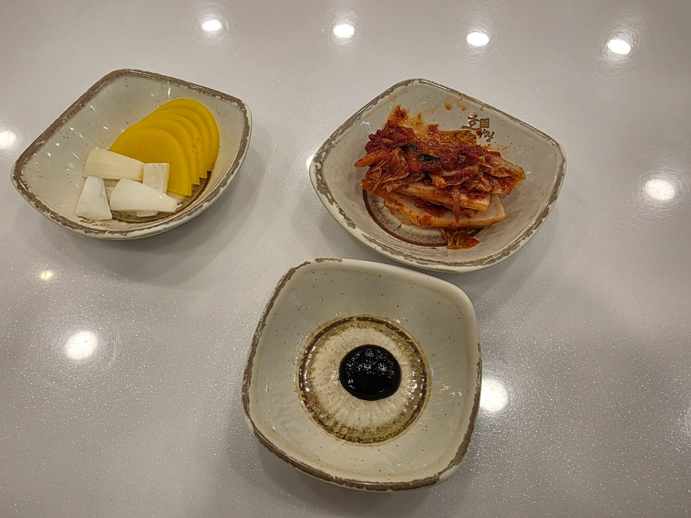 자리 잡고 앉자마자 단무지, 양파, 춘장, 김치가 세팅되고, 테이블엔 간장, 식초, 고춧가루, 젓가락, 수저, 휴지 등 필요한 도구들이 빠짐없이 준비되어 있어 편하게 식사할 수 있었어요.