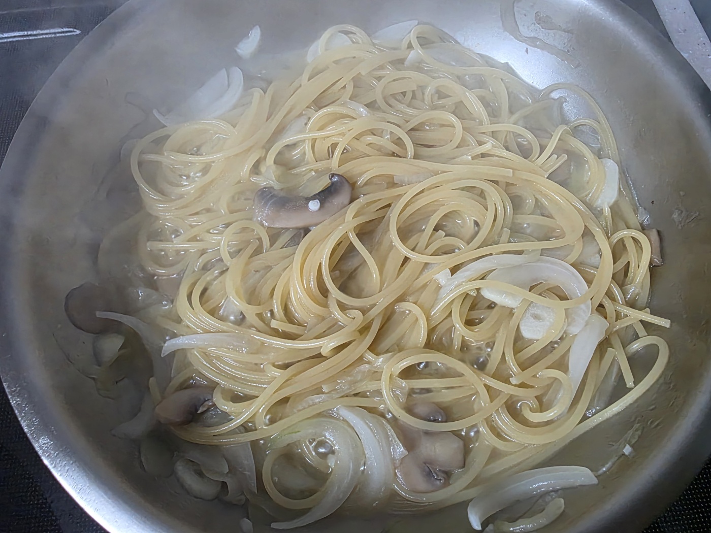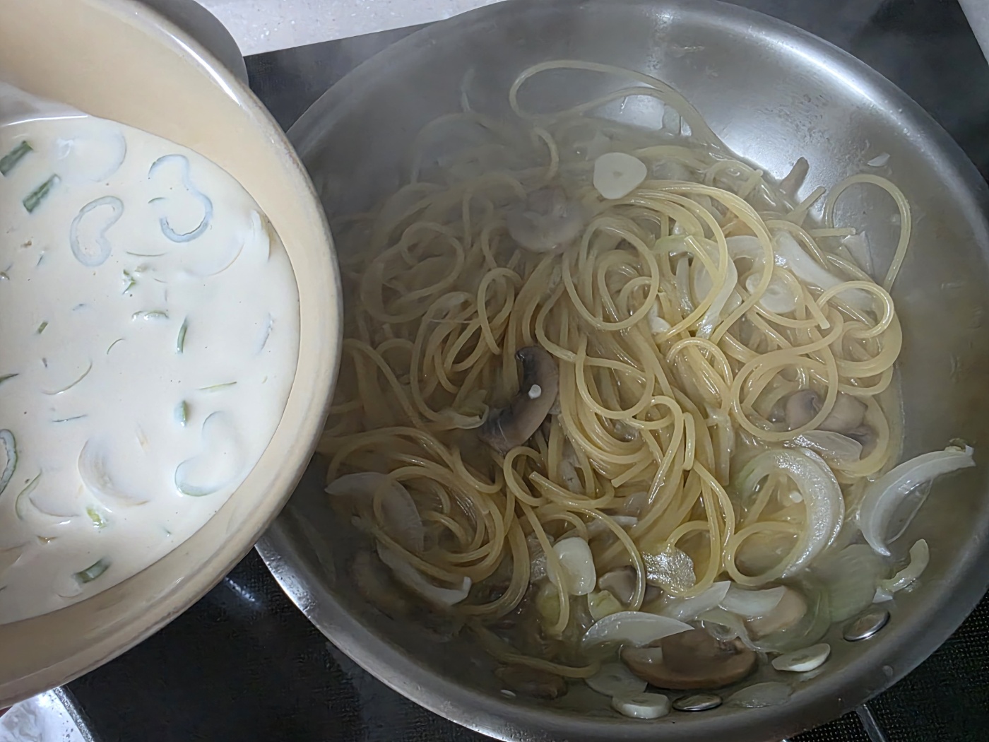 3. 원팬 조리: 면 삶기 → 크림 투입