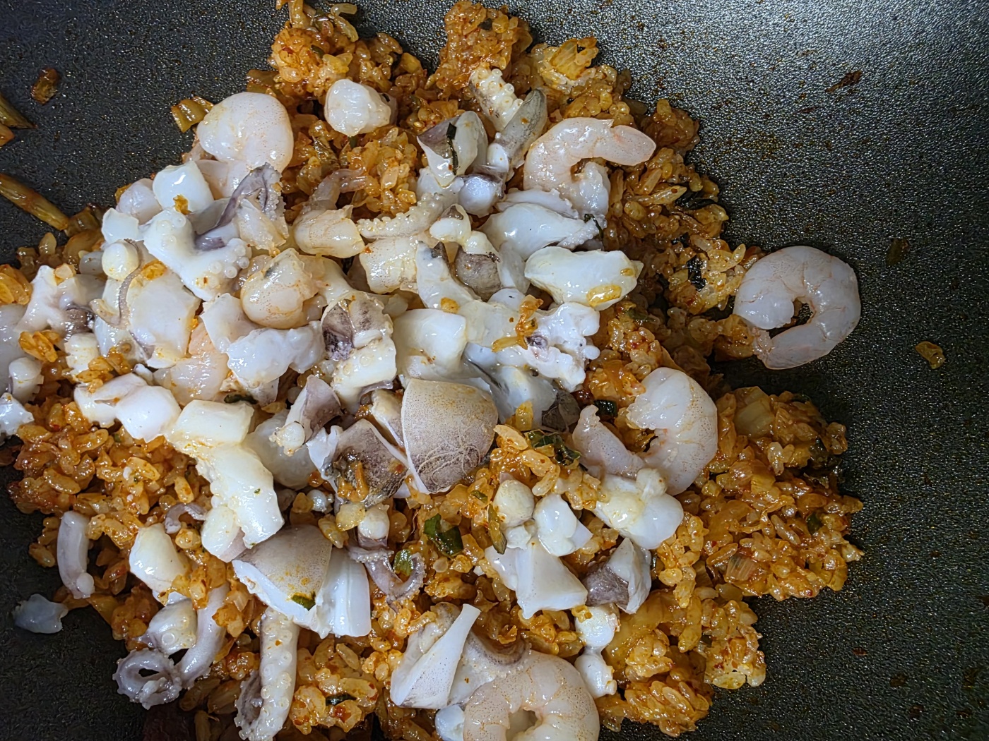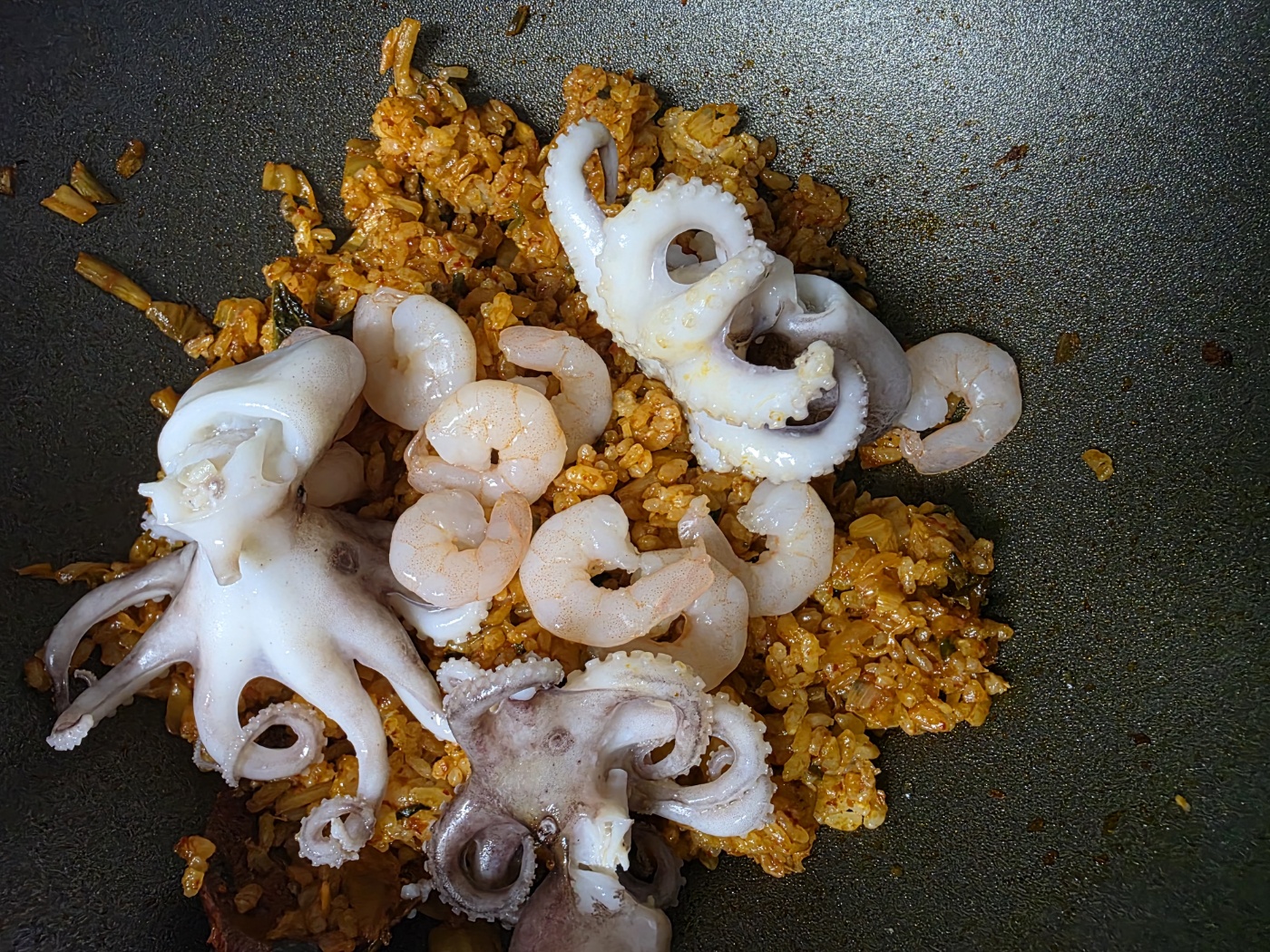 볶음밥에 어느 정도 양념이 배면, 데친 주꾸미와 새우를 넣고 살짝 볶아요.