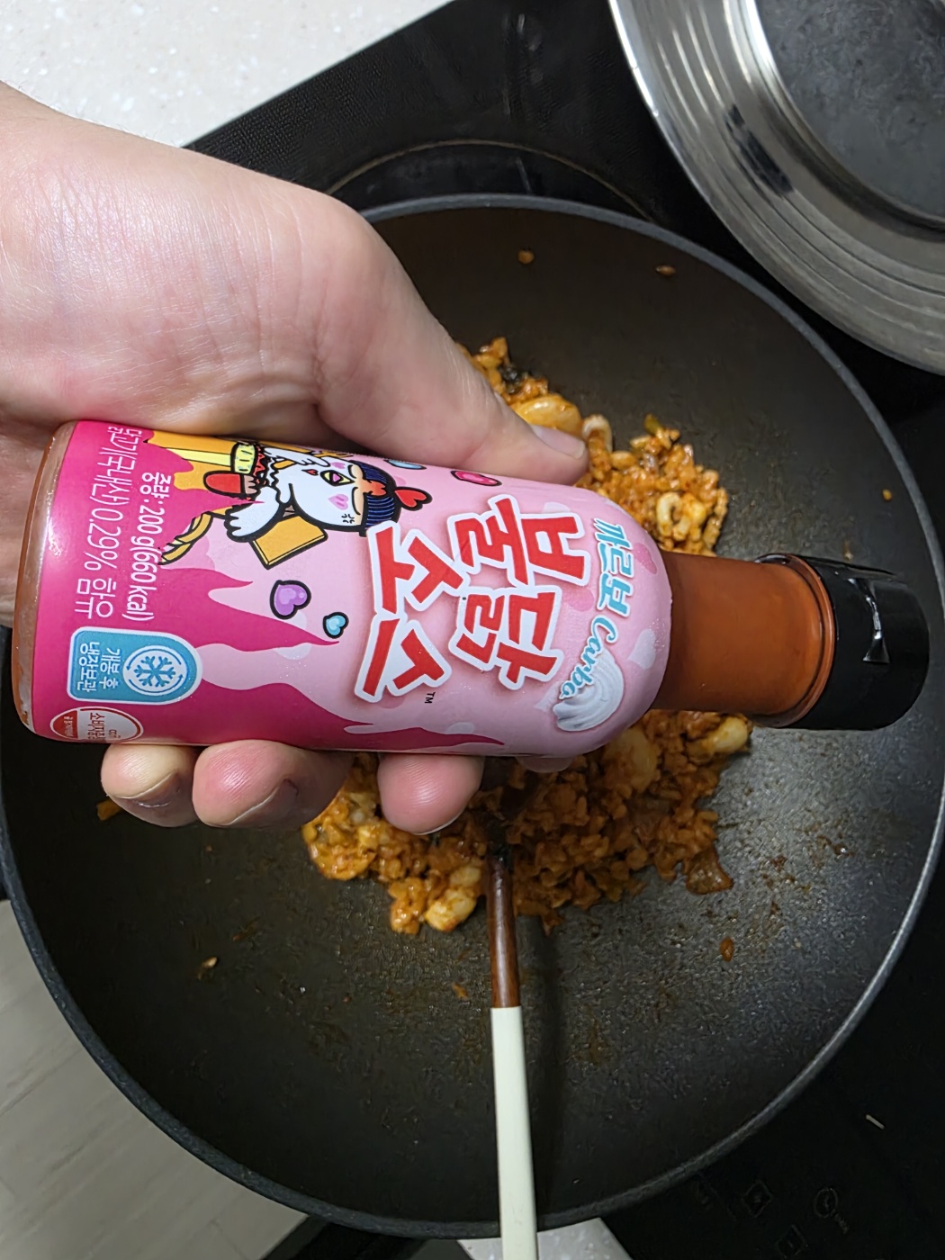 끄기 직전 참기름 한 바퀴 둘러주고, 케첩 1큰술과 카르보나라 불닭 소스 약간 넣어 풍미를 한층 더 끌어올려 주세요.