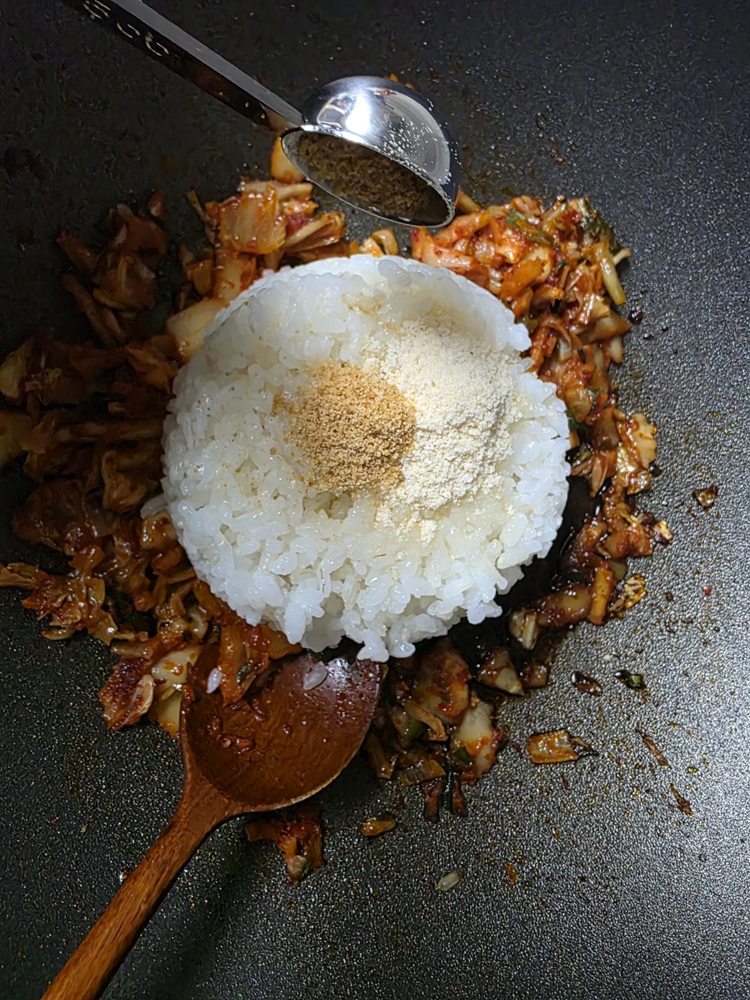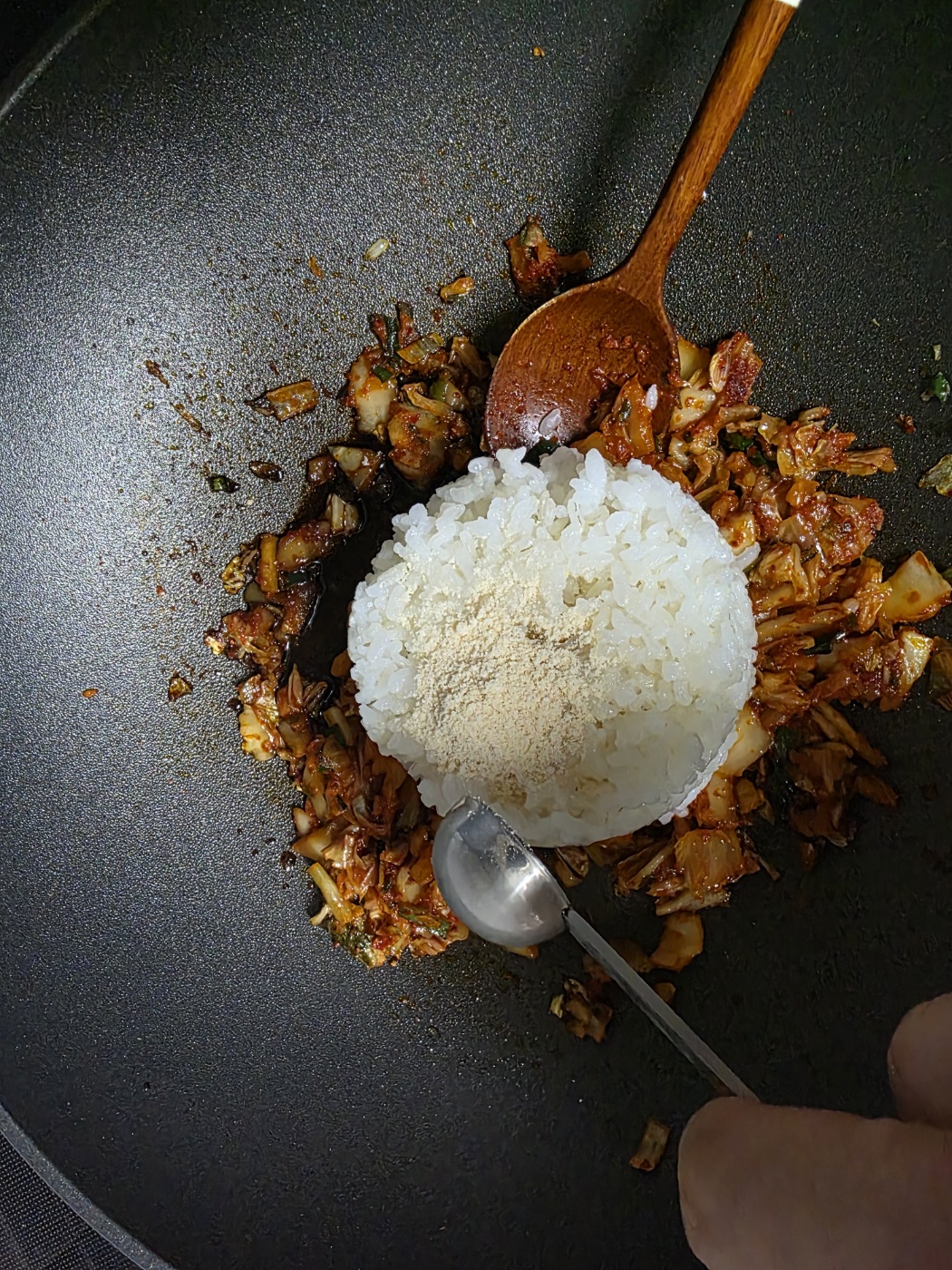 김치가 충분히 볶아졌다면 밥을 넣고 잘 풀어주세요.