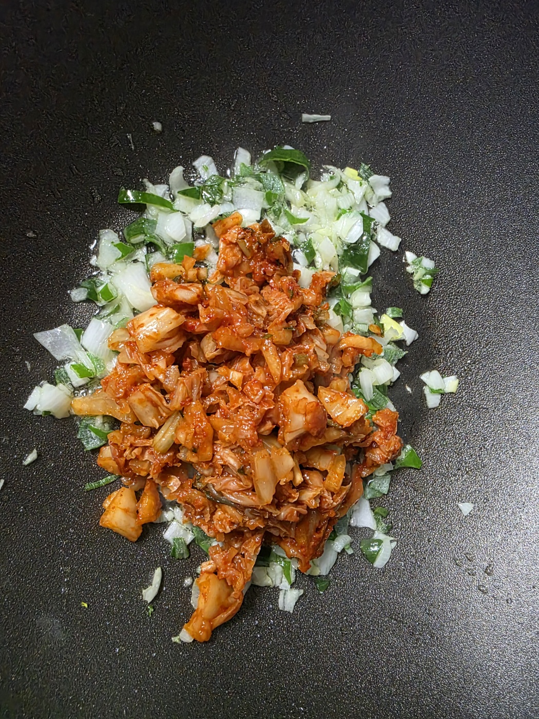 파가 투명하게 변하며 향이 올라오면 잘게 썬 김치를 넣고 중불로 볶아요.